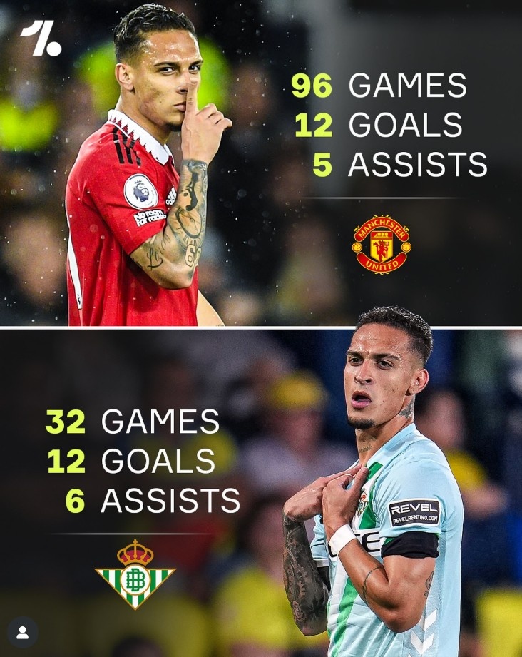 据统计,安东尼在贝蒂斯生涯32场各项赛事贡献12球6助攻,直接参与18球,而其在曼联生涯96场比赛打进12球助攻5次,直接参与17球。